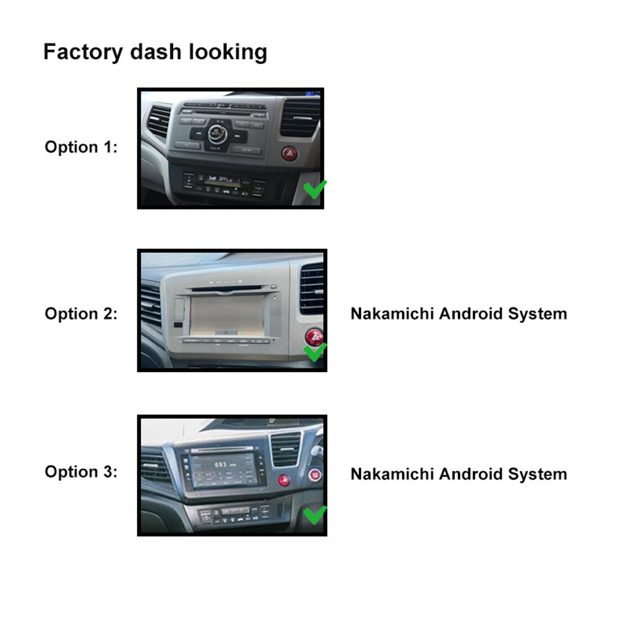 - Option 2 & 3: With factory screen model, Nakamichi Android ONLY. Extra cost for specific harness.